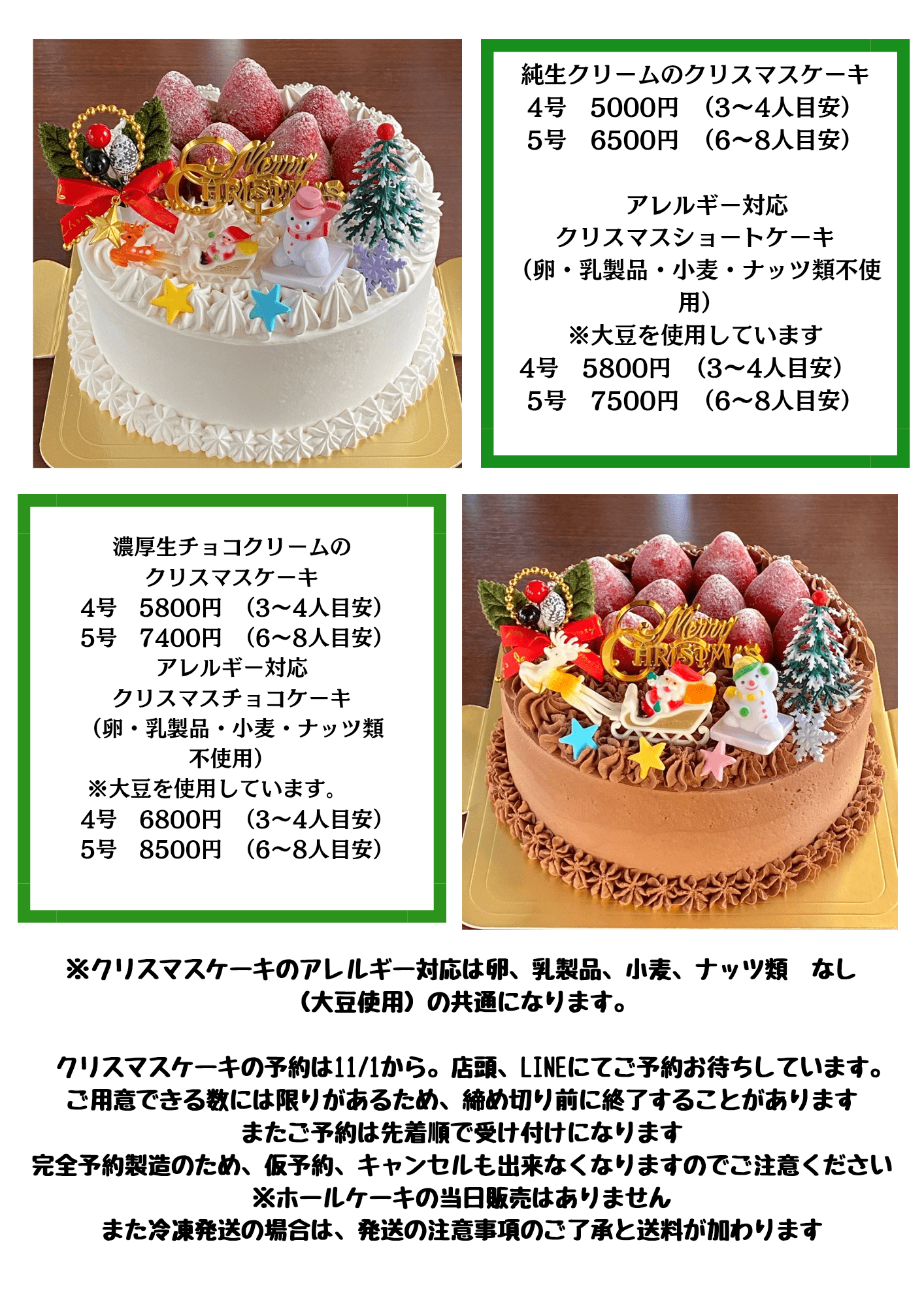 2025.10.17 純生クリームのクリスマスケーキ 4号 3800円 (3人目安) 5号 5000円 (6人目安) 6号 6700円 (9人目安) アレルギー対応クリスマ_20251017_144338_0000